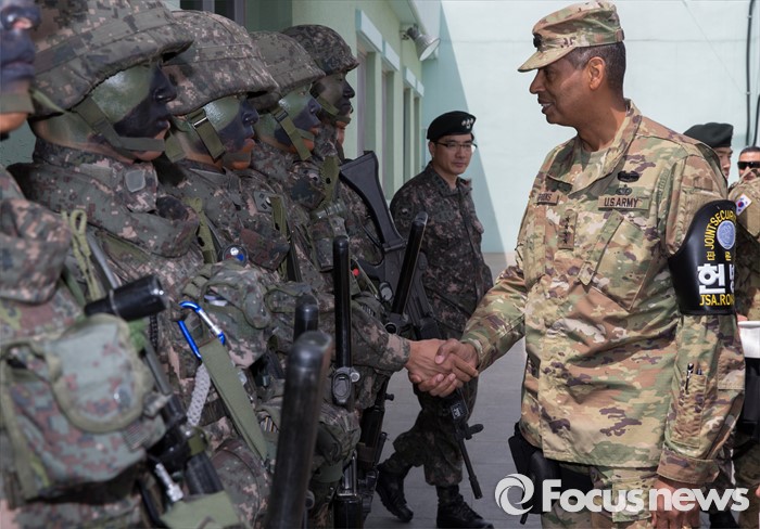 (파주=포커스뉴스) 빈센트 브룩스 신임 한·미연합사령관 겸 주한미군사령관이 12일 오후 경기도 파주시 JSA(공동경비구역)를 방문, 오울렛 초소에서 한국군 장병들과 악수를 하고 있다.
