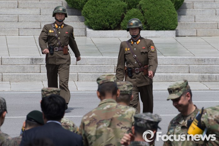 (파주=포커스뉴스) 빈센트 브룩스 신임 한·미연합사령관 겸 주한미군사령관과 이순진 합참의장이 12일 오후 경기도 파주시 판문점 공동경비구역(JSA)을 방문, 북한군 병사들이 미군과 남측 인원들을 주시하고 있다.
