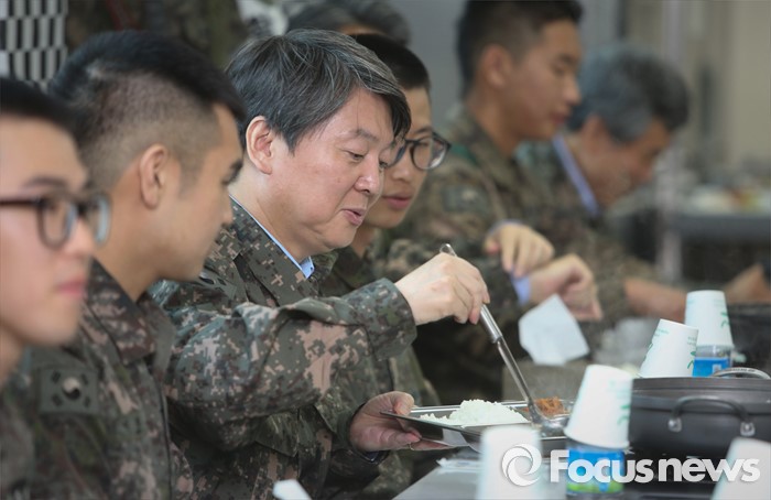 (연천=포커스뉴스) 안철수(왼쪽 세번째) 국민의당 상임공동대표가 12일 오후 경기도 연천 전방부대를 방문해 장병들과 오찬을 하고 있다.