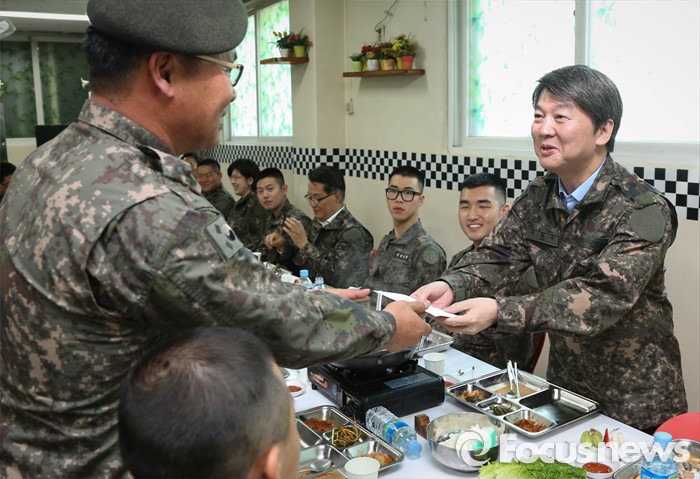 (연천=포커스뉴스) 안철수(오른쪽) 국민의당 상임공동대표가 12일 오후 경기도 연천 전방부대를 방문해 군 관계자에게 격려금을 전달하고 있다.