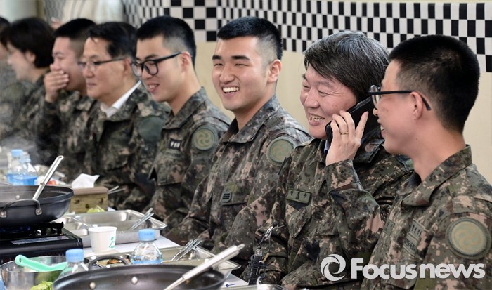 (연천=포커스뉴스) 안철수(오른쪽 두번째) 국민의당 상임공동대표가 12일 오후 경기도 연천 전방부대를 방문해 장병들과의 오찬 중 이상석 장병의 어머니와 통화를 하고 있다.
