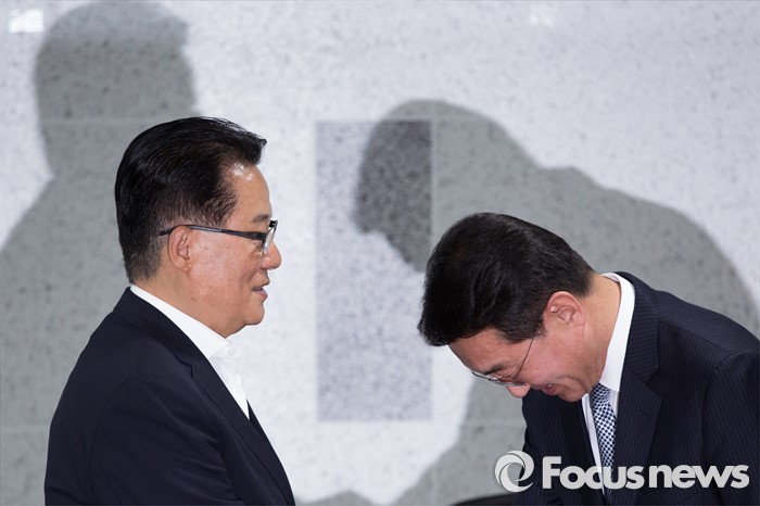 (서울=포커스뉴스) 박근혜 대통령과 3당 원내대표의 회담을 앞두고 현기환(오른쪽) 청와대 정무수석이 12일 오후 서울 여의도 국회의원회관에서 박지원 국민의당 원내대표와 면담에 앞서 악수 하고 있다.