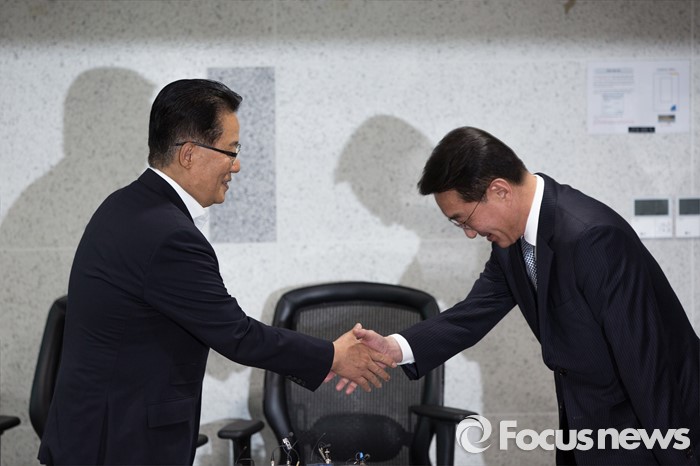 (서울=포커스뉴스) 박근혜 대통령과 3당 원내대표의 회담을 앞두고 현기환(오른쪽) 청와대 정무수석이 12일 오후 서울 여의도 국회의원회관에서 박지원 국민의당 원내대표와 면담에 앞서 악수 하고 있다.