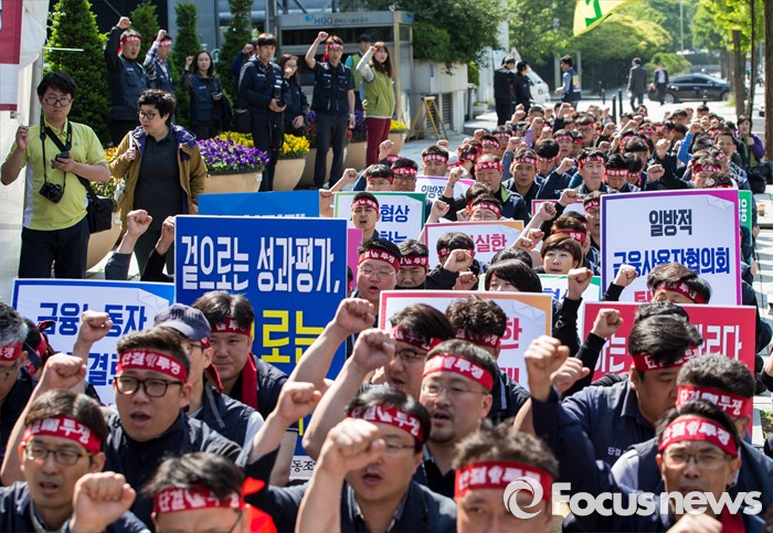 (서울=포커스뉴스) 정부가 성과주의 고삐를 바짝 죄자 금융노사 갈등이 고조되고 있다. 야권도 성과주의 반대 움직임에 가세하면서 파열음은 커져만 간다.