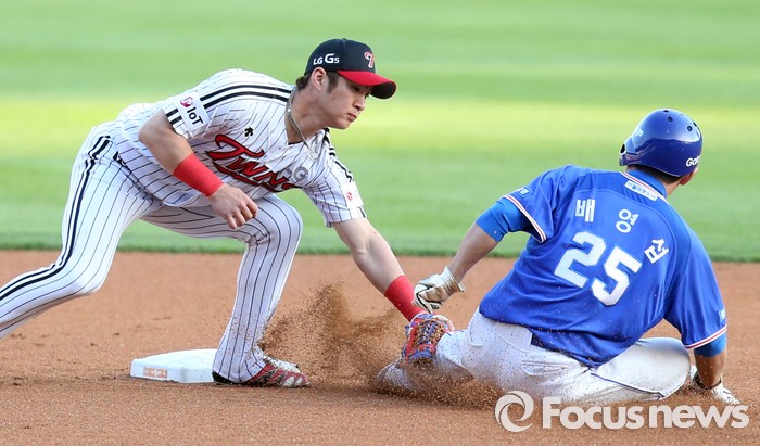 (서울=포커스뉴스) 12일 서울 잠실구장에서 열린 2016 프로야구 삼성-LG 경기 1회초 삼성 선두타자로 나와 볼넷으로 진루한 배영섭이 박해민의 삼진 아웃때 2루 도루를 시도하다 LG 유격수 오지환에게 태그아웃되고 있다.