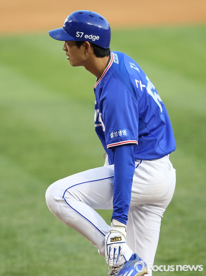(서울=포커스뉴스) 12일 서울 잠실구장에서 열린 2016 프로야구 삼성-LG 경기 3회초 2사 1,3루에서 삼성 구자욱이 투구에 발을 맞았다고 주심에게 어필하고 있다. 합의판정으로 몸에 맞는 볼로 진루했다.