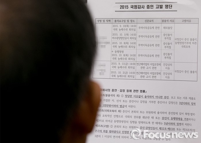 (서울=포커스뉴스) 12일 오후 서울 여의도 국회에서 열린 농림축산식품해양수산위원회 전체회의에 참석한 한 의원이 지난해 국정감사 불출석 고발 명단을 살펴보고 있다.
