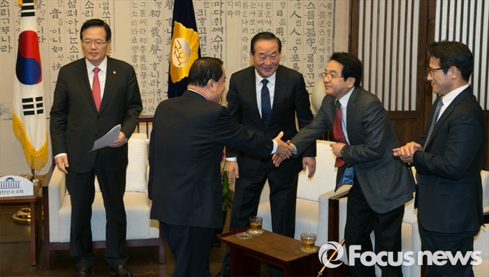 이날 만찬에는 정갑윤 국회부의장과 심재철‧이주영 의원 등이 참석했다.31일 오후 서울 여의도 국회 의장접견실에서 정의화 국회의장 주재로 열린 여야 중진 의원 회동에 참석한 의원들이 인사하고 있다. 왼쪽부터 정 의장, 문희상 더불어민주당 의원, 서청원 새누리당 최고위원, 심재철, 정병국 의원. 2015.12.31 박동욱 기자
