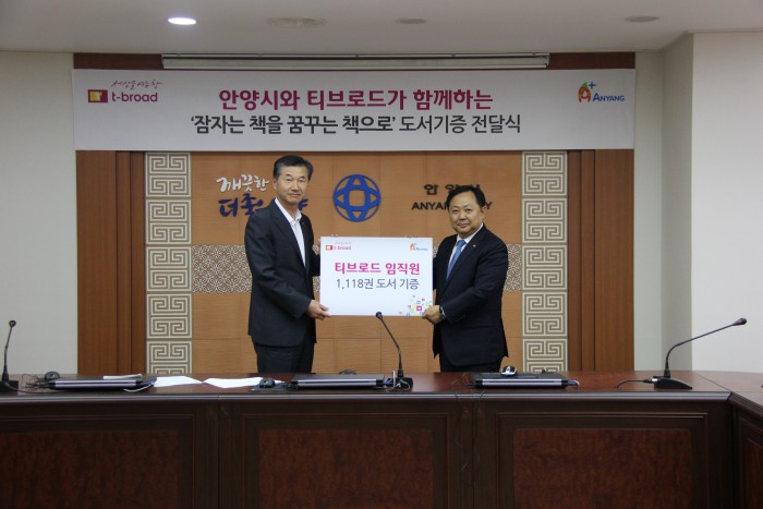 티브로드는 12일 안양시 동안구 관양동에 위치한 안양시청 전자회의실에서 이진호 안양시 부시장, 전영일 티브로드 영업본부장, 장형석 티브로드 ABC방송 사업부장과 관계자들이 참석한 가운데 도서기증 전달식을 가졌다.