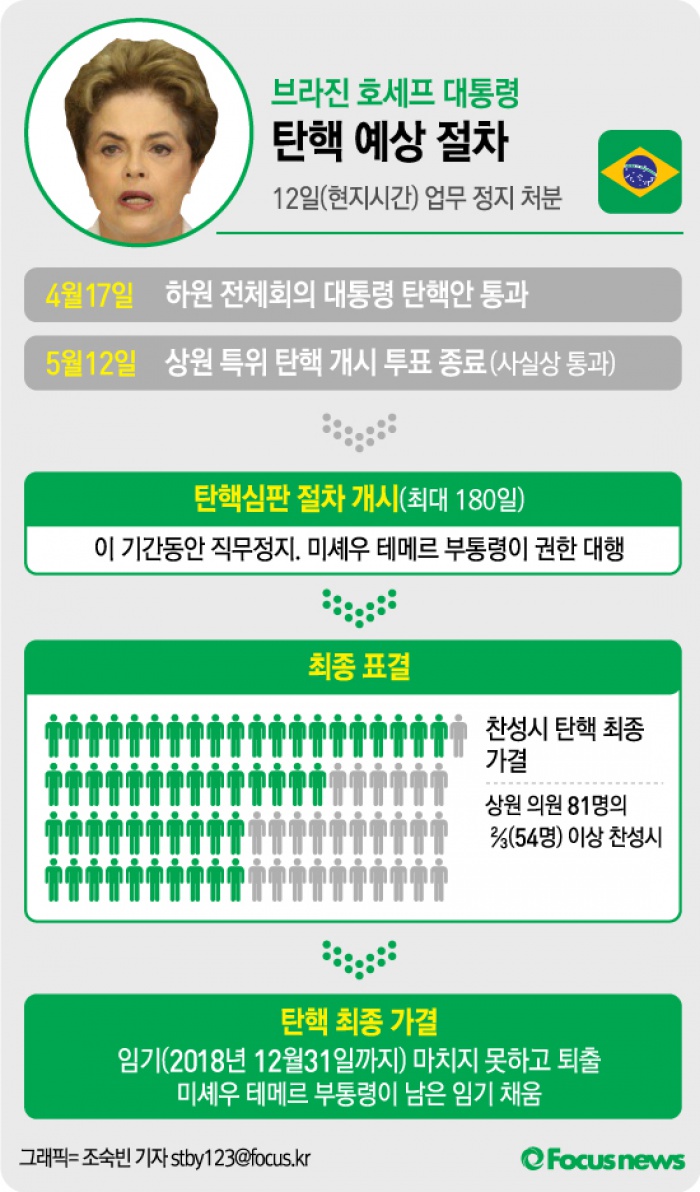 (서울=포커스뉴스) 지우마 호세프 브라질 대통령에 대한 탄핵심판 절차 개시로 직무가 정지됐다. 탄핵안이 최종 가결되면 임기(2018년 12월31일까지)를 마치지 못하고 퇴출당하게 된다.