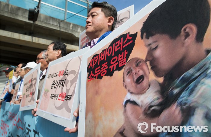 (서울=포커스뉴스) 13일 오전 서울 용산구 미8군 2번 게이트 앞에서 전쟁반대평화실현국민행동을 비롯한 시민단체 회원들이 '서울 한복판 지카바이러스 실험추진, 주한미군 규탄 기자회견'을 하고 있다.