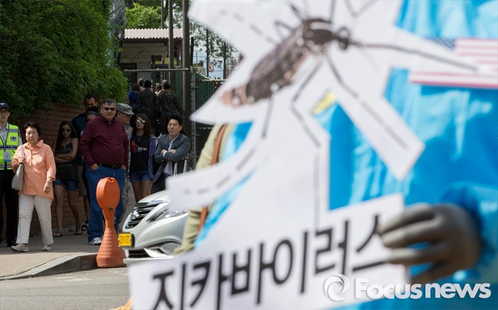 (서울=포커스뉴스) 13일 오전 서울 용산구 미8군 2번 게이트 앞에서 전쟁반대평화실현국민행동을 비롯한 시민단체 회원들이 '서울 한복판 지카바이러스 실험추진, 주한미군 규탄 기자회견'을 하고 있다.