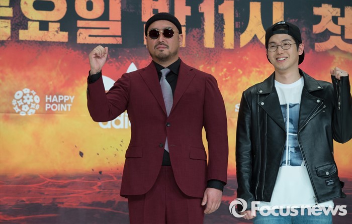 (서울=포커스뉴스) 13일 오전 서울 영등포구 타임스퀘어 아모리스홀에서 열린 Mnet '쇼미더머니5' 제작발표회에 참석한 래퍼 길(왼쪽)과 매드클라운이 포토타임을 갖고 있다.