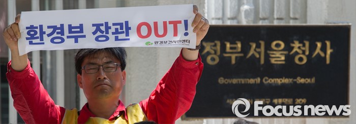 (서울=포커스뉴스) 13일 오후 서울 종로구 정부서울청사 후문에서 가습기살균제피해자와가족모임을 비롯한 시민단체 회원들이 '윤성규 환경부 장관 해임 요구 기자회견'을 하고 있다.