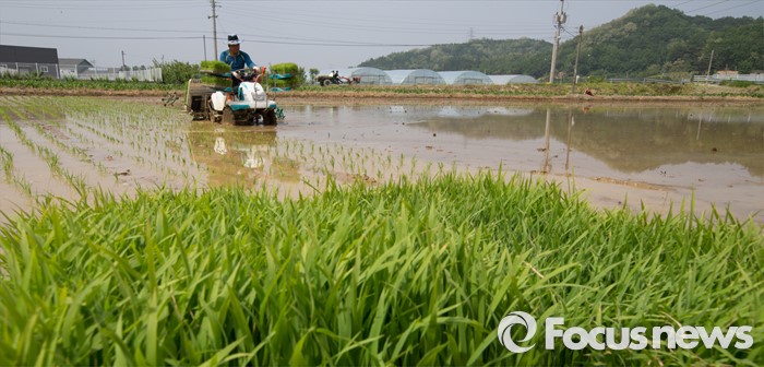(청주=포커스뉴스) 13일 오후 충북 청주시 서원구의 한 논에서 농민이 이양기를 이용해 모내기를 하고 있다.
