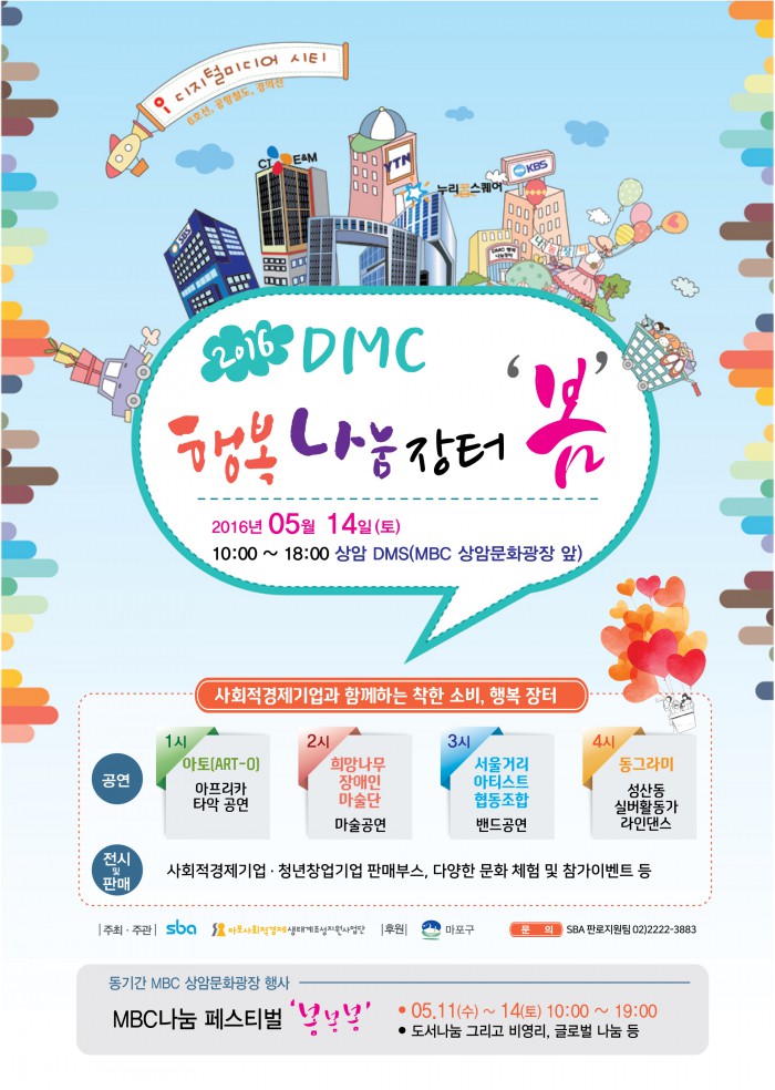 (서울=포커스뉴스) 서울시와 서울산업진흥원(SBA)는 유통과 판로확보에 어려움을 겪고 있는 사회적기업과 청년창업기업을 위해 'DMC 행복나눔장터 봄'을 연다고 13일 밝혔다.