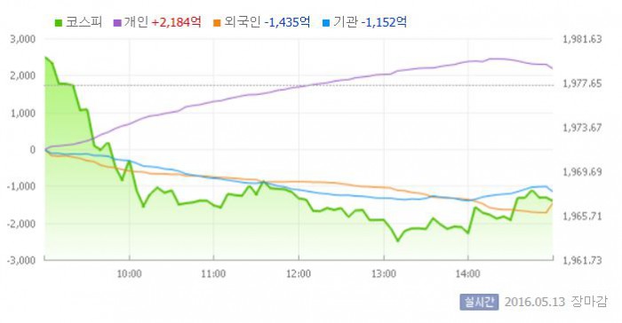 이날 코스피는 전일 대비 0.13% 상승한 1979.97로 장을 시작했다. 그러나 지수는 외국인과 기관의 동반 매도에 하락세로 방향을 바꿨다.