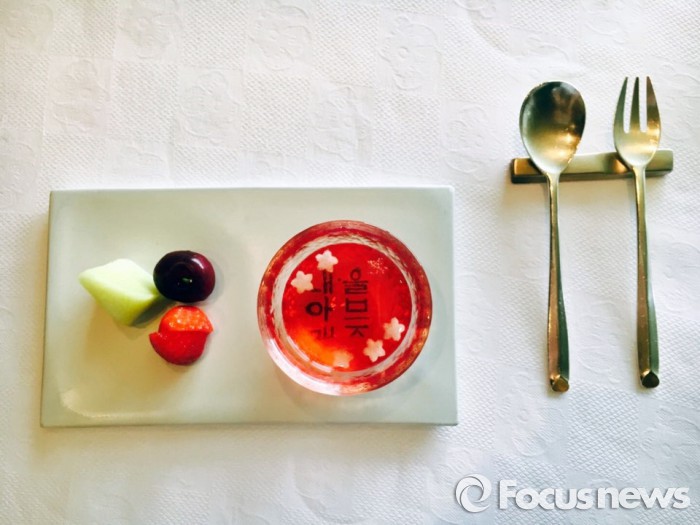 식사 순서는 △식전 먹거리△식전 찬 2종△궁중야채 전구절△오늘의 죽과 침채△삼색전△버섯탕수육△애체 신선로△두부지짐이와 호박튀김△영양밥과 야채 된장찌개, 별미찬△후식이었다.