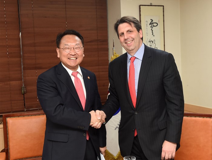 (서울=포커스뉴스) 13일 서울 종로구 정부서울청사에서 유일호(왼쪽) 경제부총리 겸 기획재정부 장관이 마크 리퍼트 주한 미국대사와 면담에 앞서 기념촬영 하고 있다. <사진제공=기획재정부>