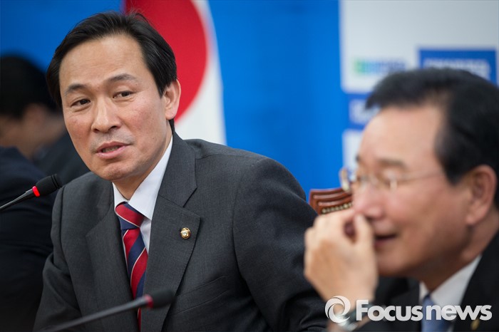 (서울=포커스뉴스) 우상호(왼쪽) 더불어민주당 원내대표가 13일 오후 서울 여의도 국회에서 '박근혜 대통령과 여야 3당 원내지도부 회동' 결과에 대해 브리핑하고 있다.