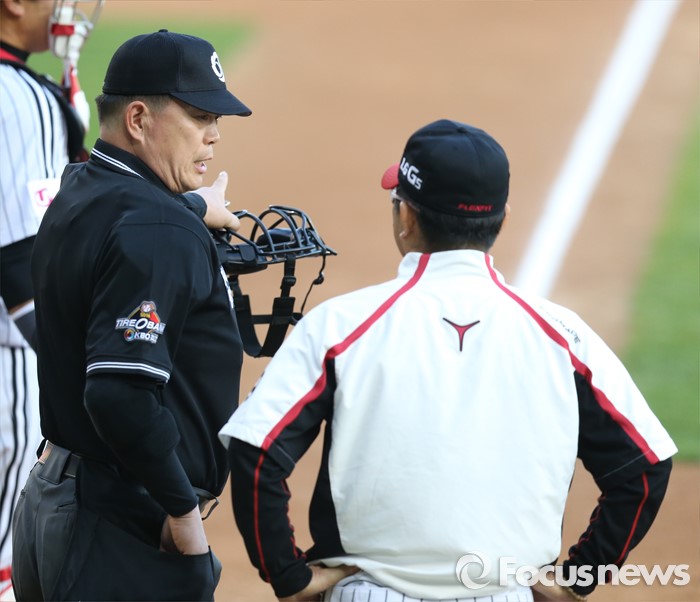 (서울=포커스뉴스) 13일 서울 잠실구장에서 열린 2016 프로야구 SK-LG 경기 1회초 1사후 LG 양상문 감독이 문승훈 주심에게 SK 조동화의 스트라이크 아웃 낫아웃 판정에 대해 항의하고 있다.