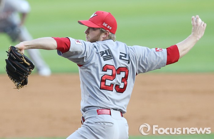 (서울=포커스뉴스) 13일 서울 잠실구장에서 열린 2016 프로야구 SK-LG 경기에서 1회말 SK 선발투수 켈리가 투구하고 있다.