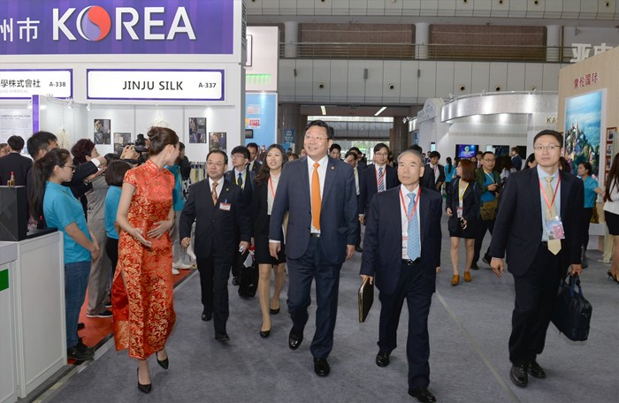 (서울=포커스뉴스) 주형환 산업통상자원부 장관이13일 중국 시안 취장국제전시센터 A홀에서 시안 실크로드박람회 주빈국 참여로 농식품, 생활용품, 의류, 화장품, 의약품 등 5대 소비재 품목의 소비재기업관, SM 융합상품관, 한국식품관(aT), K-HIT관, VR체험관(삼성전자), FTA홍보관 등 기업부스 50개사, 단체부스 50개사가 참여한 가운데 열린 ‘실크로드박람회’「국가홍보관(한국관)」개막식에 참석하여, 한국제품 전시장을 둘러보고 있다. <사진제공=산업통상자원부>