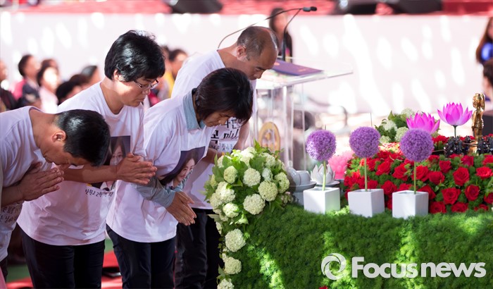 (서울=포커스뉴스) 14일 오전 서울 종로구 조계사 대웅전에서 열린 불기 2560년 부처님 오신날 봉축 법요식에서 세월호 유가족들이 헌화하고 있다.