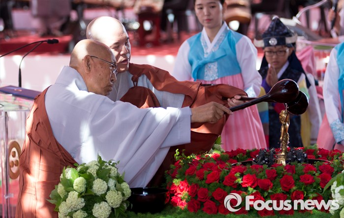 (서울=포커스뉴스) 14일 오전 서울 종로구 조계사 대웅전에서 열린 불기 2560년 부처님 오신날 봉축 법요식에서 총무원장 자승 스님과 원로회의 의장 밀운 스님이 관불의식을 하고 있다.