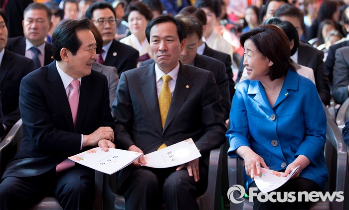 (서울=포커스뉴스) 14일 오전 서울 종로구 조계사 대웅전에서 열린 불기 2560년 부처님 오신날 봉축 법요식에서 심상정(오른쪽) 정의당 대표와 정세균(왼쪽) 의원이 대화하고 있다. 가운데는 우상호 더불어민주당 원내대표.