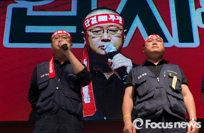 (서울=포커스뉴스) 14일 오후 서울 강서구 KBS스포츠월드에서 성과연봉제 저지를 위한 금융공기업지부 합동 대의원대회에 참석한 김문호(왼쪽) 금융노조 위원장이 총파업을 결의하는 삭발식을 마치고 발언하고 있다.