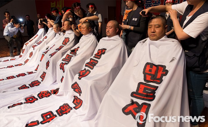 (서울=포커스뉴스) 14일 오후 서울 강서구 KBS스포츠월드에서 성과연봉제 저지를 위한 금융공기업지부 합동 대의원대회에 참석한 김문호 금융노조 위원장과 금융공기업 지부 위원장들이 총파업을 결의하며 삭발식을 하고 있다.