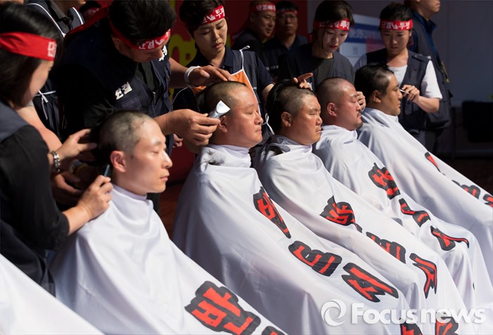 (서울=포커스뉴스) 14일 오후 서울 강서구 KBS스포츠월드에서 성과연봉제 저지를 위한 금융공기업지부 합동 대의원대회에 참석한 김문호 금융노조 위원장과 금융공기업 지부 위원장들이 총파업을 결의하며 삭발식을 하고 있다.