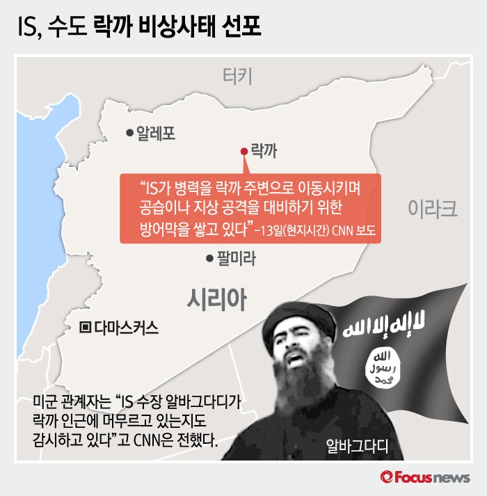 (서울 포커스뉴스) CNN이 미국 장교들을 인용해 13일(현지시간) "IS가 자칭 수도인 락까 지역에 병력을 이동시키며 공습과 지상군 공격을 대비하기 위한 방어막을 쌓으며 비상사태를 선포한 것을 봤다"고 보도했다. 또한, 군 관계자의 말을 인용해 IS의 수장인 알바그다디의 소재를 파악하기 위해 노력 중이라고도 밝혔다.