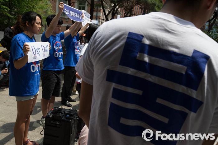 (서울=포커스뉴스) 15일 오전 서울 용산구의 한 대형마트 앞에서 환경운동연합원들이 옥시 불매를 촉구하며 기자회견을 하고 있다.