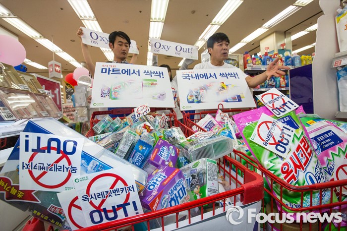 (서울=포커스뉴스) 15일 오전 서울 용산구의 한 대형마트에서 환경운동연합 회원들이 옥시제품 판매 즉각 철수를 촉구하며 불매운동 퍼포먼스를 하고 있다.