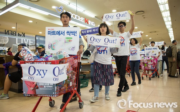 (서울=포커스뉴스) 15일 오전 서울 용산구의 한 대형마트에서 환경운동연합 회원들이 옥시제품 판매 즉각 철수를 촉구하며 불매운동 퍼포먼스를 하고 있다.