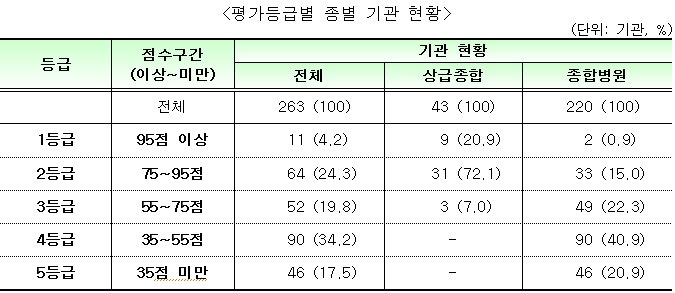심사평가원은 평가대상 의료기관을 5등급으로 구분했으며, 1등급은 11기관(상급종합병원 9기관, 종합병원 2기관)으로 평가대상의 4.2%에 불과했다.