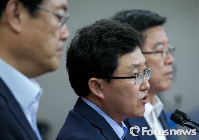 (서울=포커스뉴스) 새누리당 혁신위원장으로 임명된 김용태(가운데) 의원이 15일 오후 서울 여의도 당사에서 정진석(왼쪽) 원내대표, 김광림 정책위의장과 함께 기자회견을 하고 있다.