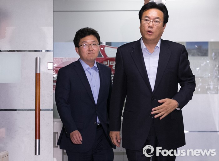 (서울=포커스뉴스) 정진석(오른쪽) 새누리당 원내대표가 15일 오후 서울 여의도 당사에서 혁신위원장으로 임명된 김용태 의원과 함께 기자회견을 위해 입장하고 있다.