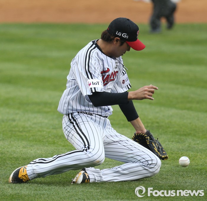 (서울=포커스뉴스) 15일 서울 잠실구장에서 열린 2016 프로야구 SK-LG 경기 2회초 1사 1,2루애서 SK 김성현의 내야땅볼을 LG 투수 우규민이 잡으려다 비가 내린 잔디 위에서 미끄러져 넘이지고 있다.
