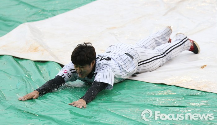 (서울=포커스뉴스) 15일 서울 잠실구장에서 열린 2016 프로야구 SK-LG 경기가 2회말을 마치고 우천으로 경기가 취소되자 LG 서상우가 팬 서비스로 비가 괴인 비가림막 위에서 슬라이딩을 하고 있다.
