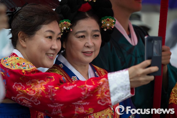 (서울=포커스뉴스) 세종대왕 탄신 619주년인 15일 오후 서울 종로구 경복궁 일대에서 열린 세종대왕 어가행렬 재현행사에 참가한 시민들이 사진을 찍고 있다.