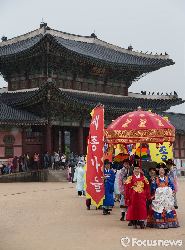 (서울=포커스뉴스) 세종대왕 탄신 619주년인 15일 오후 서울 종로구 경복궁 일대에서 세종대왕 어가행렬이 재현되고 있다.