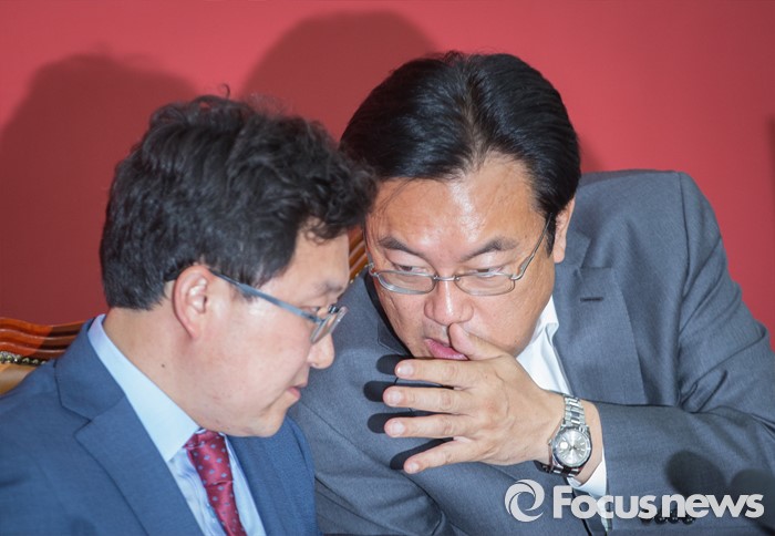 (서울=포커스뉴스) 정진석(오른쪽) 새누리당 원내대표가 16일 오전 서울 여의도 국회에서 열린 비상대책위원회 상견례에서 김용태 혁신위원장과 대화하고 있다.