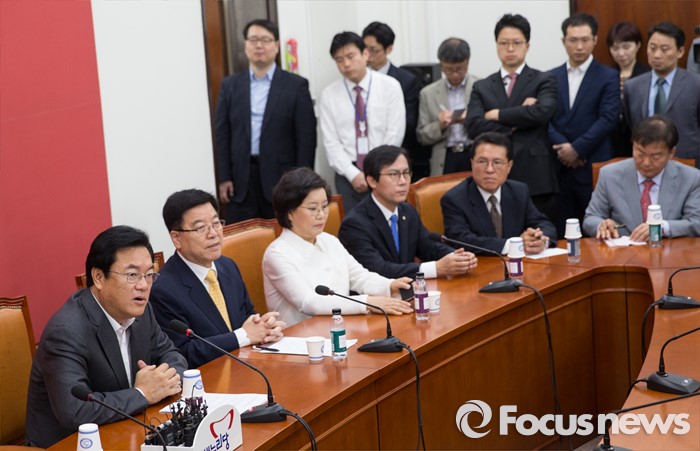 (서울=포커스뉴스)정진석 새누리당 원내대표와 김광림 정책위의장을 비롯한 비대위원들이 16일 오전 서울 여의도 국회에서 열린 비상대책위원회 상견례를 갖고 있다. 왼쪽부터 정 원내대표, 김 정책위의장, 이혜훈, 김영우, 정운천 비대위원.