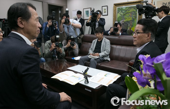 (서울=포커스뉴스) 박지원(오른쪽) 국민의당 원내대표가 16일 오전 서울 여의도 국회 의원회관을 방문한 최문순 강원도지사와 현안 관련 면담을 하고 있다.