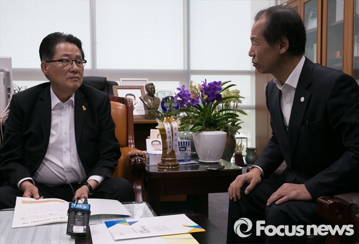 (서울=포커스뉴스) 박지원(왼쪽) 국민의당 원내대표가 16일 오전 서울 여의도 국회 의원회관을 방문한 최문순 강원도지사와 현안 관련 면담을 하고 있다.