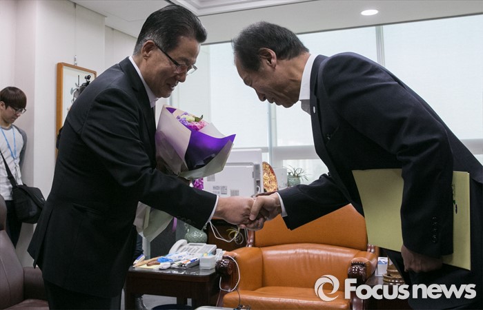 (서울=포커스뉴스) 박지원(왼쪽) 국민의당 원내대표가 16일 오전 서울 여의도 국회 의원회관을 방문한 최문순 강원도지사로부터 면담에 앞서 당선 축하 꽃다발을 받고 있다.