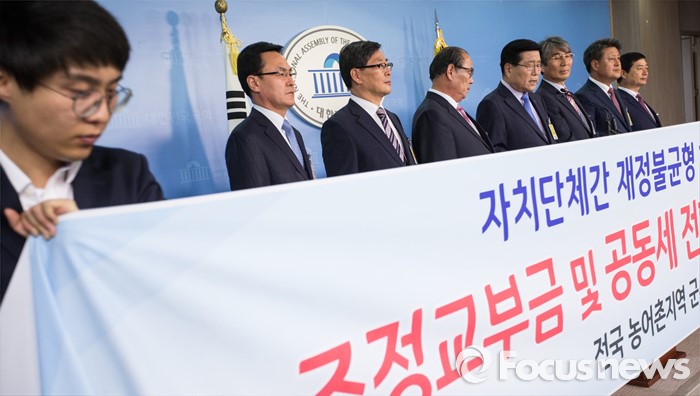 (서울=포커스뉴스) 한상기 태안군수를 비롯한 전국 농어촌지역 군수협의회 회장단이 16일 오전 서울 여의도 국회 정론관에서 정부의 지방재정개혁 이행 촉구 기자회견을 하고 있다.